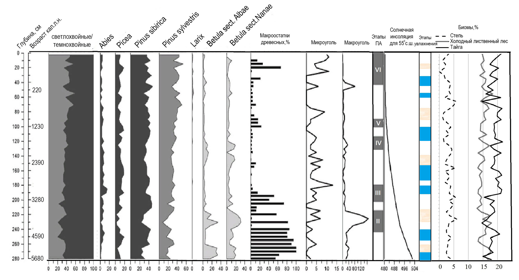 Рис. 7. Сводная диаграмма индикаторов палеоэкологических условий для реконструкции болото Большое. Процентное соотношение пыльцы светлохвойных и темнохвойных; пыльца основных представителей древесных (процент от АР); изменение количества макроостатков древесных (суммарная доля коры и древесины от объема пробы); микроуголь (% от НПП); количество частиц макроуголя (шт./см³); этапы усиления пожарной активности, выделенные на основе палеоантракологического анализа; солнечная инсоляция для 55° с. ш. (по Berger, Loutre, 1991); интервалы увеличения (темный тон) и уменьшения (светлый тон) увлажнения, интерпретированные по комплексу данных; динамика доминирующих типов растительности (биомы).