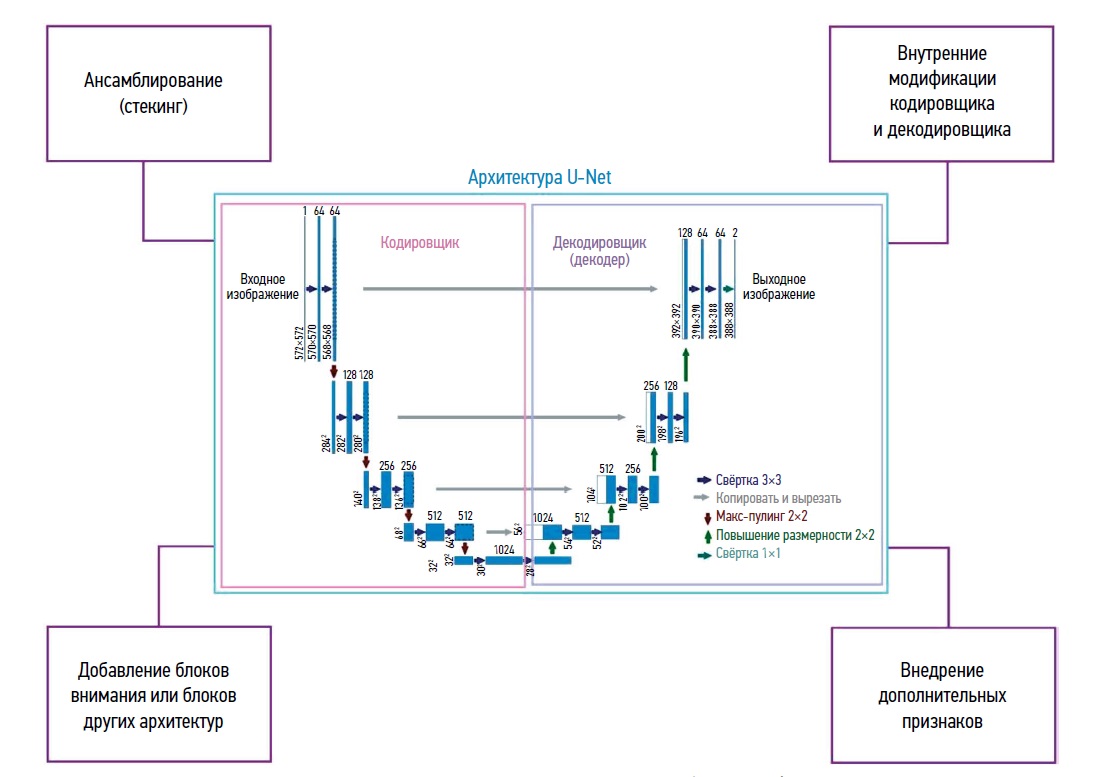 在医学诊断领域,使用神经网络的数据处理方法越来越受欢迎。它们最常用于使用计算机断层扫描和磁共振成像、超声波和其他非侵入性研究工具来研究人体器官的医学图像。在这种情况下,病理诊断归结为解决医学图像分割的问题,即搜索表征图像中某些对象的像素组(区域)。2015年开发的U-Net神经网络架构是解决这一问题的最成功方法之一。在本文中,作者分析了典型的 U-Net架构的各种改型。研究工作分为几个关键领域:编码器和解码器的改型;注意力模块的使用;与其他架构元素的结合;引入附加特征的方法;迁移学习和处理小型现实数据集的方法。研究了各种训练集,列出了文献中实现的最佳度量值(Dice相似度指标;交集大于联合Intersection over Union;总体准确性等等)。还创建了一份汇总表,说明所分析的图像类型和在这些图像上检测到的病理情况。概述了进一步改型以提高分割任务质量的有前景的方向。这些结果可能有助于疾病检测,主要是肿瘤检测。 所提出的算法可以成为专业医疗智能助手的一部分。