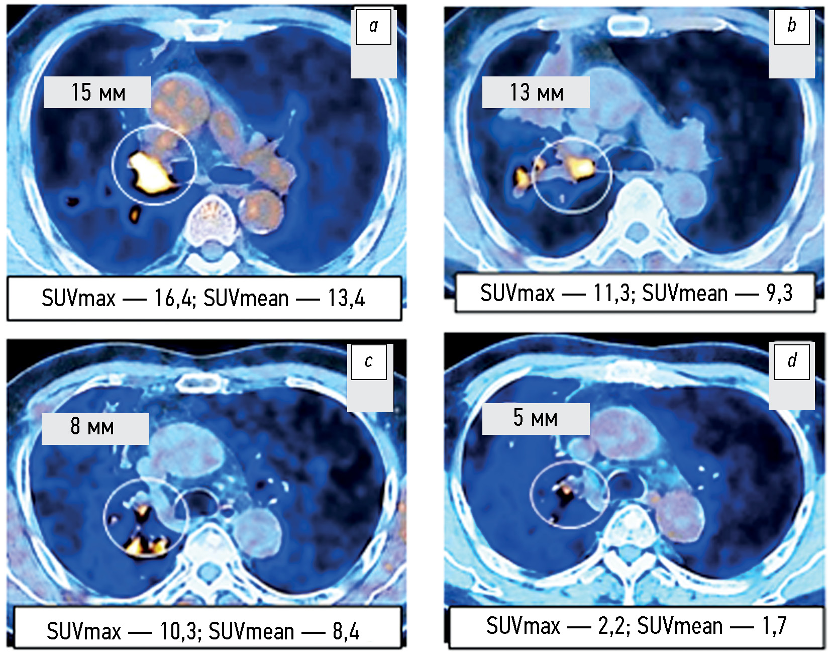 材料和方法。分析了2019年至2022年期间105名非小细胞肺癌患者的18F-氟脱氧葡萄糖(18F-FDG)正电子发射和计算机断层扫描相结合的研究方案,其中包括75名EGFR基因活化突变的患者。辐射负载因人而异,范围为45至90mSv。18F-FDG放射性药物的容积活性为260-500MBq。 评估了治疗前和治疗开始后1.5-2.0个月内最大靶灶直径总和以及代谢指数SUVmax和 SUVmean的变化。在17名非小细胞肺癌患者中,正电子发射断层扫描和计算机断层扫描相结合变化的观察持续时间至少为12个月。