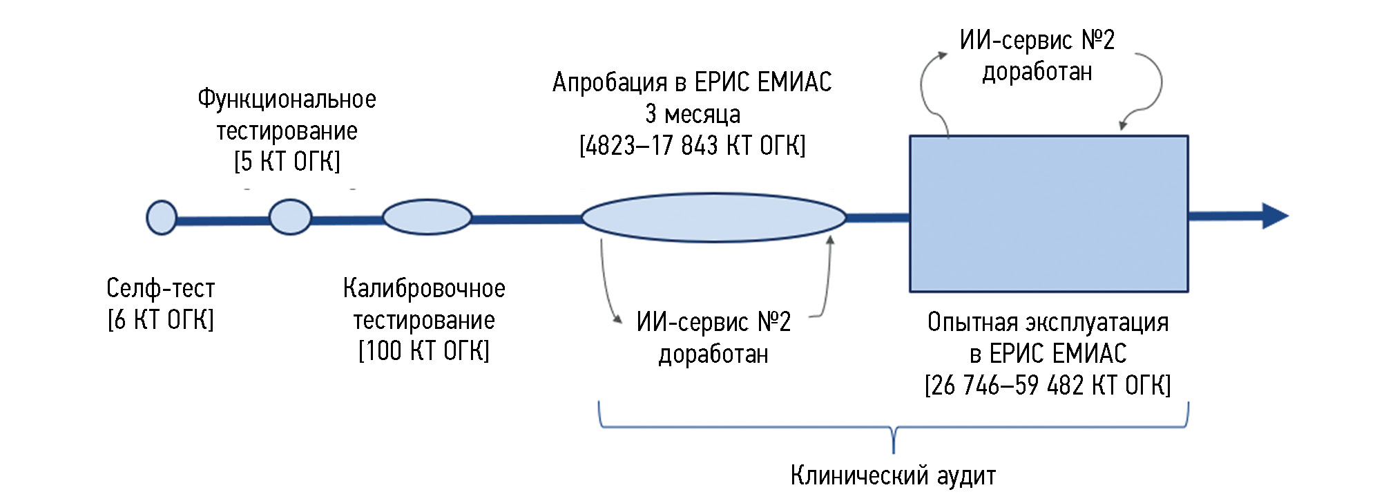 材料和方法。为了设定人工智能服务的临床任务,形成了“椎体压缩性骨折(骨质疏松)”为方向的基本诊断要求。服务通过了以下阶段:自测、功能测试、校准测试、验证和试运行。在前三个阶段,测试是在先前准备好的数据集上进行的。 在验证和试运行阶段,使用人工智能服务对医疗机构的计算机断层扫描的检测数据进行了分析。在各个阶段医生专家小组开展工作,评估服务的诊断准确性和功能实用性。将获得的人工智能服务准确性的定量指标与目标值进行比较。