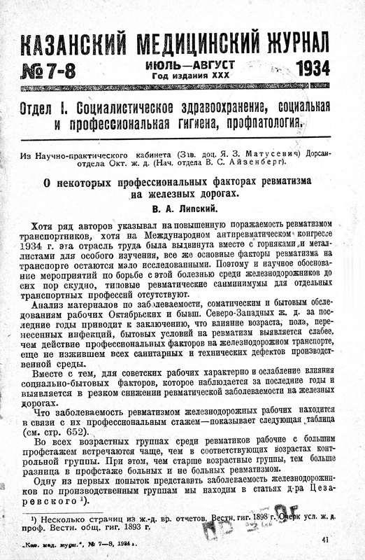 Хотя ряд авторов указывал на повышенную поражаемость ревматизмом транспортников, хотя на Международном антиревматическом конгрессе 1934 г. эта отрасль труда была выдвинута вместе с горняками и металлистами для особого изучения, все же основные факторы ревматизма на транспорте остаются мало исследованными. Поэтому и научное обоснование мероприятий по борьбе с этой болезнью среди железнодорожников до сих пор скудно, типовые ревматические санминимумы для отдельных транспортных профессий отсутствуют.