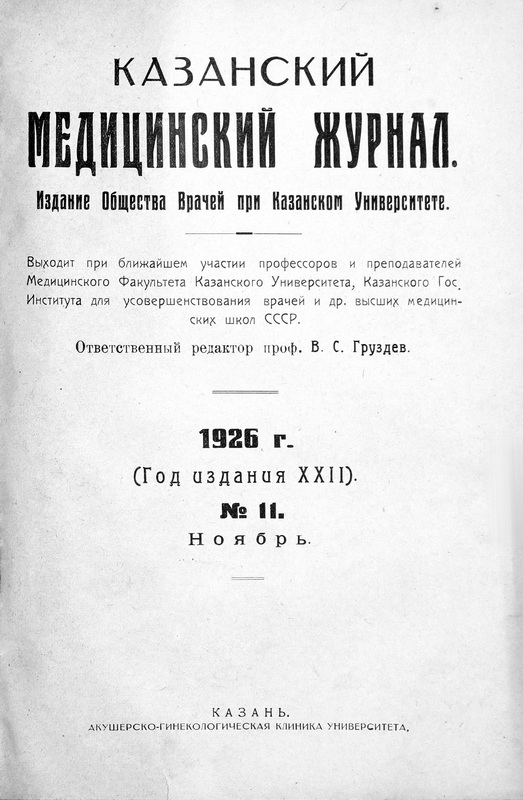 On October 29, at a public meeting of the Educational Council of the Kazan Medical Faculty, Dr. Z. I. Malkin defended the work presented by the author as a work of high qualifications, under the title "Non-specific therapy". The official opponents were proff. V. M. Aristovsky, N. K. Goryaev and M. N. Cheboksarov.