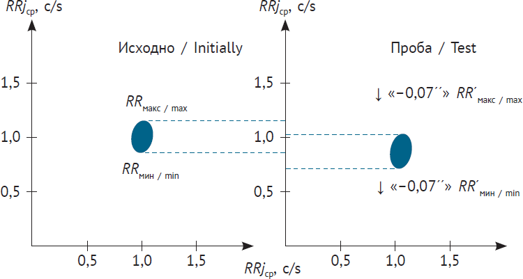 Наглядная иллюстрация вегетативного обеспечения сердечной деятельности с дезадаптацией за счет высокой реактивности обоих отделов ВНС представлена на рис. 6. Очевидно, что исходно по КРГ определяется ваготонический тип вегетативной регуляции (RRср = 1,1 с). При дыхательной пробе отмечается гиперреактивность парасимпатического отдела ВНС, поскольку исходно продолжительность интервала RRмакс = 1,16 с, при дыхательной пробе значение интервала RR’макс = 1,28 с, то есть произошло увеличение RR’макс только на 0,12 с (при норме 0,05–0,10 с). Это отражает избыточно высокую реактивность парасимпатического отдела ВНС на функциональную пробу. Исходно значение интервала RRмин = 0,77 с, а при дыхательной пробе продолжительность интервала RR’мин = 0,64 с, то есть она уменьшилась на 0,13 с (при норме 0,05–0,10 с). Подобные изменения свидетельствуют о вегетативной дисфункции с повышенной реактивностью обоих отделов ВНС на функциональную пробу.