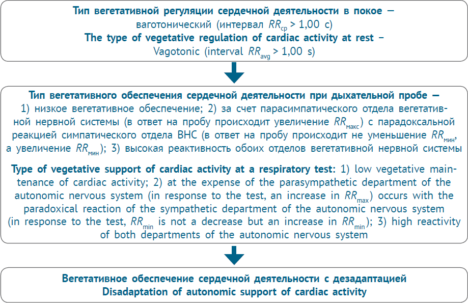 Fig. 3. Algorithm for diagnosis of neurocirculatory asthenia of a severe degree in patients with bradycardia (disadaptation of autonomic support of cardiac activity)