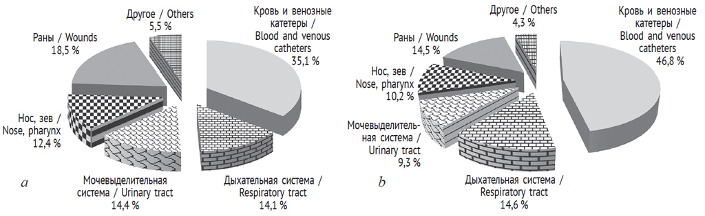 Рис. 1. Динамика удельного веса стафилококков, выделенных из разного материала от больных: a — 2011–2012 гг., b — 2015–2016 гг.