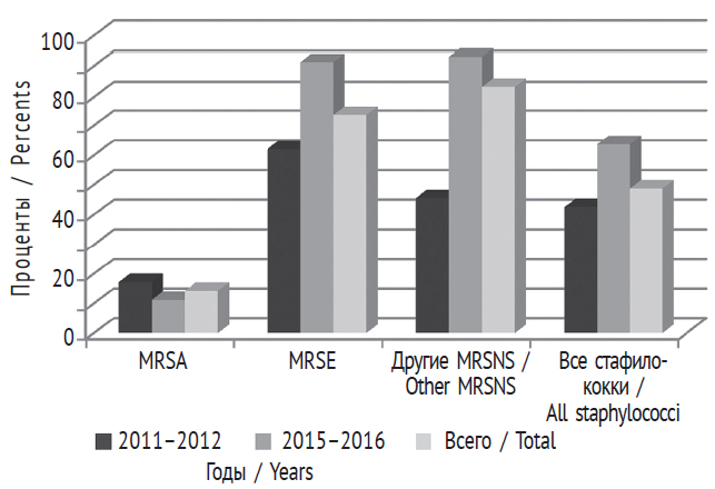 Fig. 3. Dynamics of the share of methicillin-resistant strains of staphylococci in 2011–2012 and 2015–2016