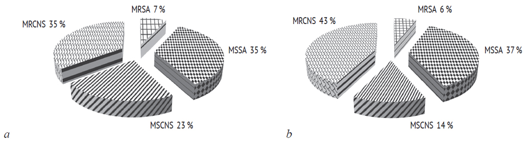 Рис. 4. Удельный вес метициллинрезистентных (MRSA), метициллинчувствительных (MSSA) S. aureus, метициллинчувствительных коагулазонегативных (MSCNS) и метициллинрезистентных коагулазонегативных (MRCNS) среди стафилококков: a — 2011–2012 гг., b — 2015–2016 гг.