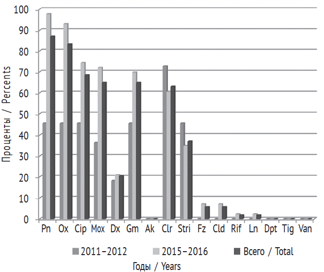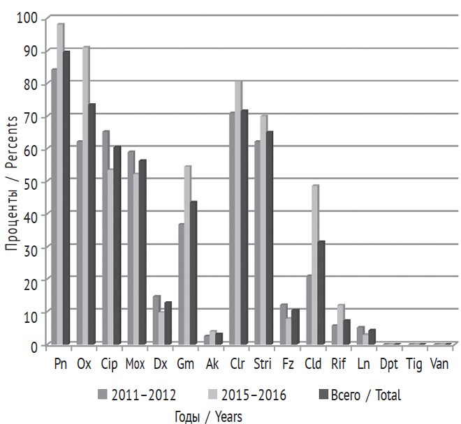 Fig. 7. Dynamics of S. epidermidis resistance to antimicrobial drugs in 2011–2012 and 2015–2016