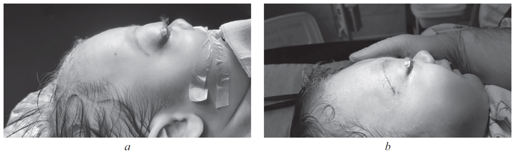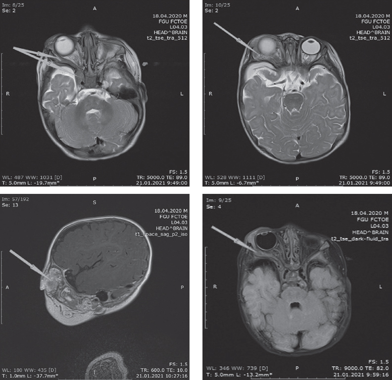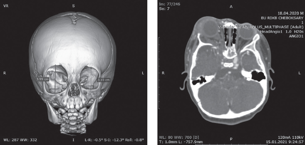 06.07.2020 в возрасте 2 мес. выполнена операция — модифицированная синустрабекулэктомия с задней трепанацией склеры на правом глазу. В послеоперационном периоде отмечается стабилизация внутриглазного давления в пределах толерантного. Ребенок наблюдался офтальмологом по месту жительства, получал гипотензивную терапию в виде инстилляций препаратов ингибиторов карбоангидразы (трусопт) и бета-адреноблокаторов (тимолол). В возрасте 3 мес. отмечено нарастание правостороннего экзофтальма, эпизоды спонтанного обратимого выворота верхнего века. По результатам компьютерной томографии (КТ) выявлено образование верхнего века, правой орбиты с распространением в переднюю черепную ямку. Произведена временная блефарорафия. Для определения дальнейшей тактики лечения пациент направлен в нейрохирургическое отделение НМИЦ им. В.А. Алмазова.