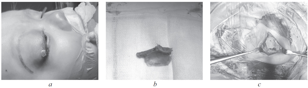 Fig. 3. Minifrontal approach: a – incisio line; b – resected area of the zygomatic process of the frontal bone; c – view of the operating field after fixation of the resected area with biodegradable miniplates
