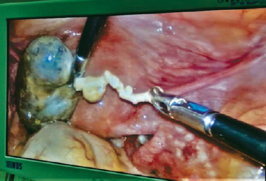 Другой патологии со стороны органов брюшной полости не выявлено. Препарат (фрагменты яичника, маточной трубы?) извлечен в эвакуаторе (рис. 4). Общая кровопотеря 20 мл.