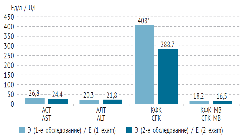 Рис. 2. Уровень протеолитических ферментов до и сразу после курса криотерапии (n = 14). Э — экспериментальная группа, КФК — креатинфосфокиназа. * Различия относительно второго обследования статистически значимы при р ≤ 0,05