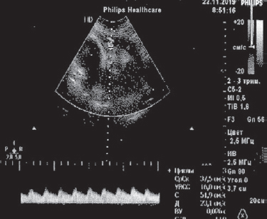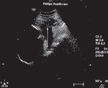 Рис. 4. Данные ультразвукового исследования через 56 дней после отхождения вод (22.11.2019), амниотический индекс 9 мм
