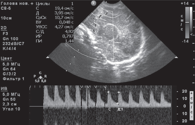 Рис. 6. Исследование кровотока в передней мозговой артерии новорожденного ребенка. Количественные характеристики допплеровского спектра кровотока в пределах нормы, нормальное периферическое сопротивление