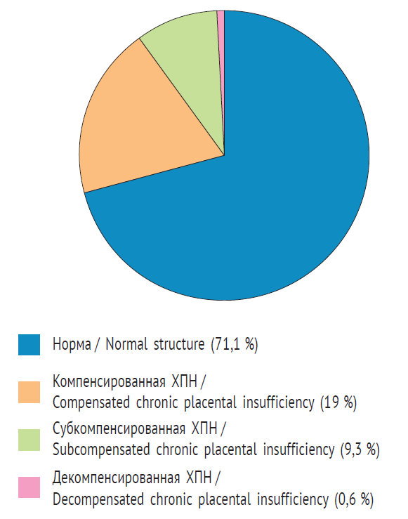Hence, the condition of the newborn is affected not solely and not so much by placental insufficiency but also by the pathological process stage. In this case, compensated placental insufficiency should be considered as an acceptable structure of the placenta with the implementation of compensatory-adaptive mechanisms on the part of the mother, foetus and placenta. Thus, for effective pregnancy and childbirth management, it is essential to develop criteria, in particular those based on ultrasound results, for the timely identification of subcompensated and decompensated stages of placental insufficiency during pregnancy.