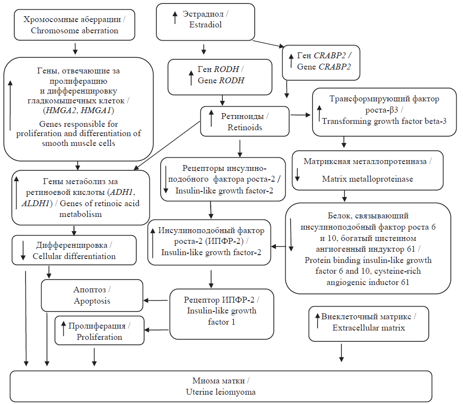 В последнее время становится все более популярной теория участия микроРНК в патогенезе мио мы матки. Н.С. Согоян и др. в своей статье изложили результаты исследования по этому вопросу [12]. Предполагается, что микроРНК влия ет на регуляцию клеточного цикла, апоптоз, дифференцировку клеток. Выявлено, что микроРНК-21 контролирует экспрессию рецептора трансформирующего фактора роста-β 2-го типа (ключевого профибротического цитокина, который вызывает гипертрофию клеток, нарушает обмен компонентов межклеточного матрикса и влияет на ангиогенез). J.B. Fitzgerald et al. доказали, что увеличение микроРНК-21 влияет на снижение апоптоза, поскольку в исследовании удалось выявить увеличение расщепления каспазы-3, что является маркером апоптоза, при снижении уровня микроРНК-21 [18].