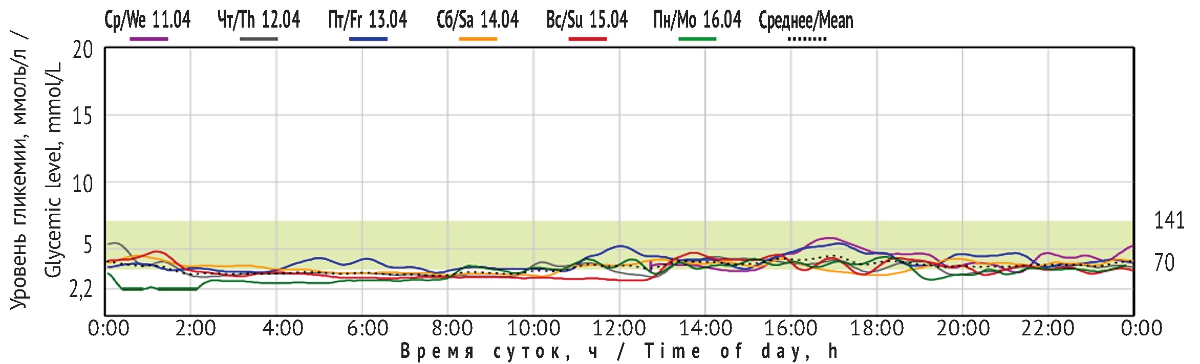 Рис. 4. Суточное сенсорное мониторирование гликемии у матери пациентки с врожденным гиперинсулинизмом