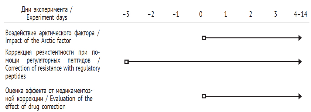 Fig. 1. General scheme of the experiment to assess the effect of peptide bioregulators on the resistance of rats to cold-stress factor