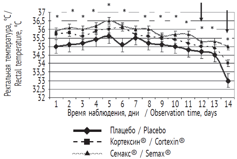 Рис. 2. Динамика уровня ректальной температуры в течение всего периода эксперимента. *Статистически значимое различие показателей у крыс в группе Семакса® относительно таковых у крыс из группы плацебо (p < 0,05). Стрелками (↓) обозначено окончание плато температуры в пределах 35 °С в группах Кортексина® и Семакса®