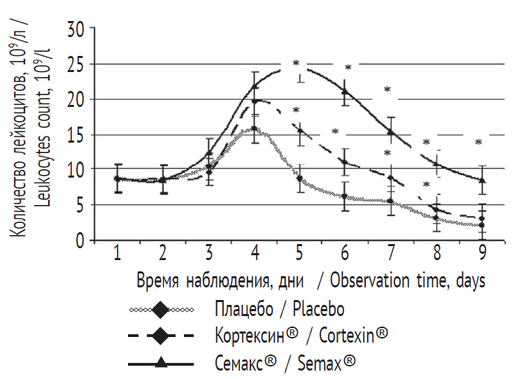 Рис. 3. Динамика количества лейкоцитов у животных их групп введения плацебо, Кортексина® и Семакса®. *Статистически значимое различие показателей относительно таковых у крыс группы плацебо (p < 0,05)
