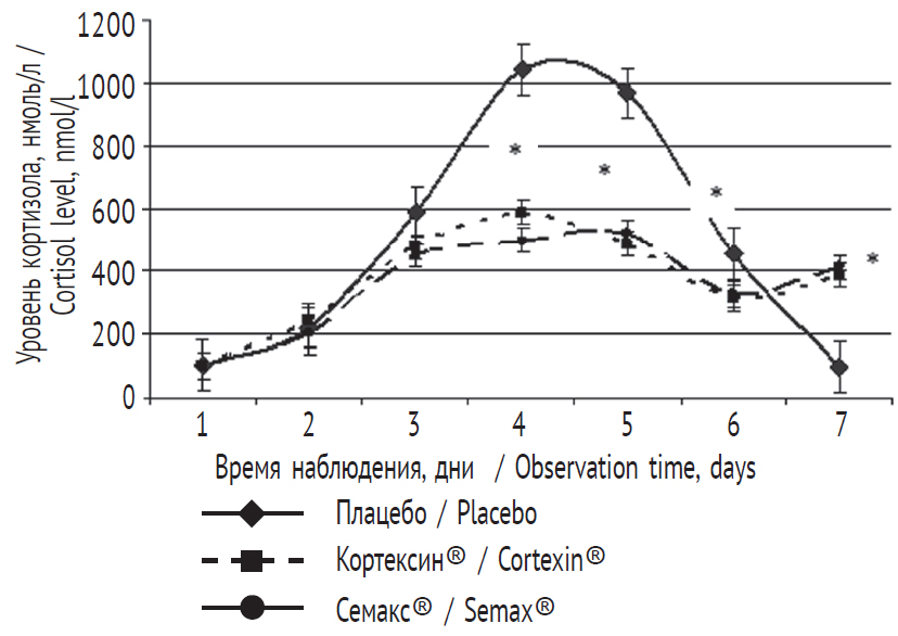 У крыс, получавших Кортексин® и Семакс®, отмечен прирост уровня кортизола на 7-й день воздействия в 5 и 4 раза соответственно, таким образом, повышение кортизола под действием РП оказалось статистически значимо ниже, чем у крыс, получавших плацебо. К концу периода воздействия уровень кортизола у крыс групп РП сохранялся в пределах умеренного повышения (350–500 нмоль/л).