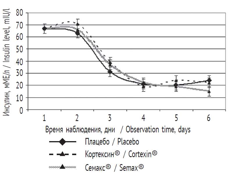 В условиях моделирования холодо-стрессорных факторов у крыс всех групп имело место значительное (примерно 3-кратное) снижение уровня инсулина в сыворотке крови на 5-й день наблюдения с сохранением гипоинсулинемии до конца воздействия, при этом межгрупповых статистически значимых различий не выявлено.