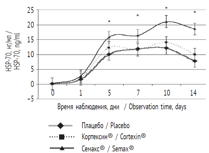 Анализ динамики содержания HSP-70 в сыворотке крови крыс при холодо-стрессорном воздействии показал, что наиболее выраженный прирост данного показателя отмечен у животных группы Cемакса®: уже с 5-х суток наблюдалось статистически значимое различие между значениями этого показателя с таковыми у крыс групп плацебо и Кортексина®, данная тенденция сохранялась до конца воздействия. Результат может свидетельствовать о способности Семакса® обеспечивать значительное и раннее перекрестное повышение устойчивости клеток к комплексному неблагоприятному воздействию (так называемая кросс-толерантность).