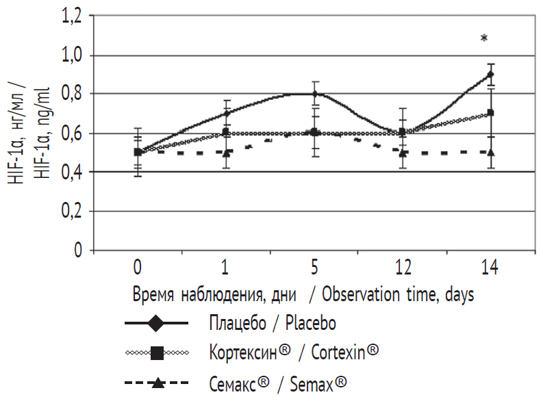 В течение периода холодо-стрессорного воздействия у крыс группы плацебо отмечена в целом статистически незначимая тенденция к увеличению содержания HIF-1α, с достижением его максимального уровня к 14-му дню (в 1,8 раза по сравнению с показателями у крыс группы Семакса®, p < 0,05), что может свидетельствовать о тенденции к развитию явлений тканевой гипоксии. У животных групп Кортексина® и Семакса® значения содержания HIF-1α практически не менялись. Таким образом, вопрос о возможном антигипоксическом эффекте данных РП требует углубленного изучения.