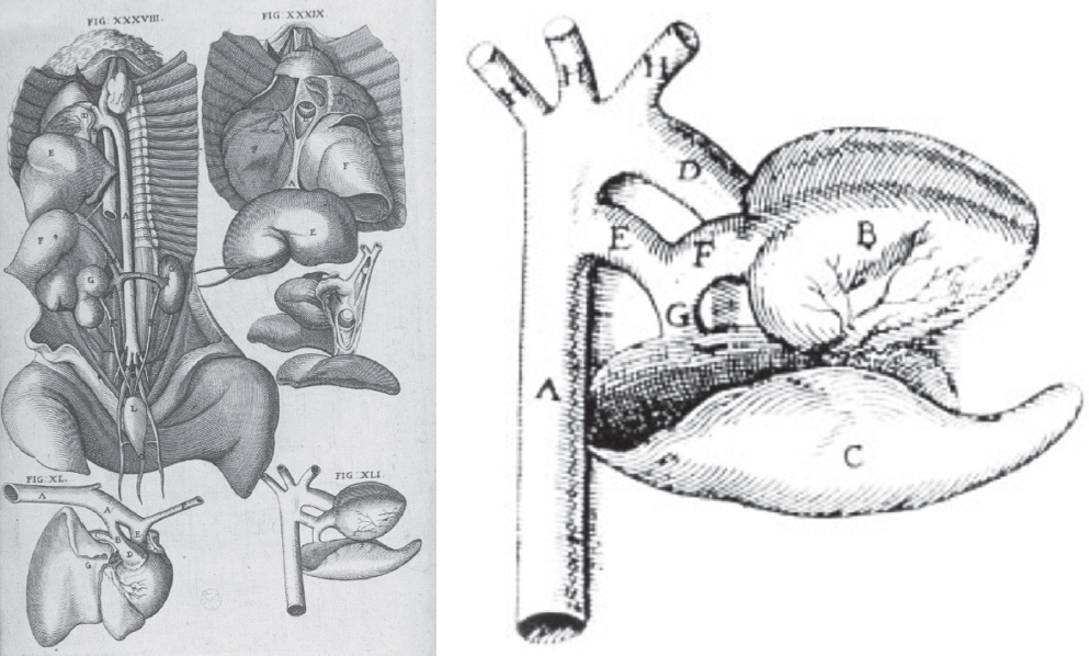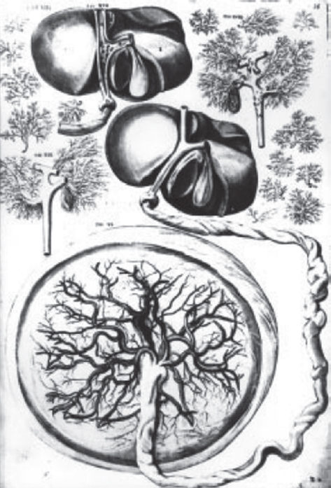 Стоит отметить, что книга И. Фабрициуса «О формировании плода» была прекрасно иллюстрирована, благодаря ей мы наблюдаем великолепно выполненные рисунки того времени и уже по их наличию можем утверждать о высокой информативности знаний о плаценте, пуповине, печени (рис. 11), венозном и АП (рис. 8).