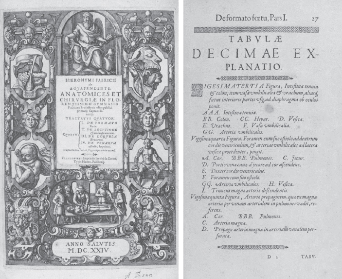 Рис. 9. Страницы книги И. Фабрициуса «De formato foetu», 1600 г.: титульная и страница 27