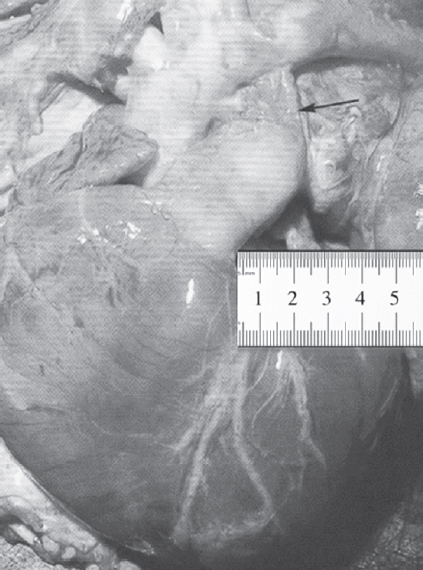 Рис. 16. Препарат сердца плода. Указателем обозначен артериальный проток шириной 1,2 см, длиной 2,6 см