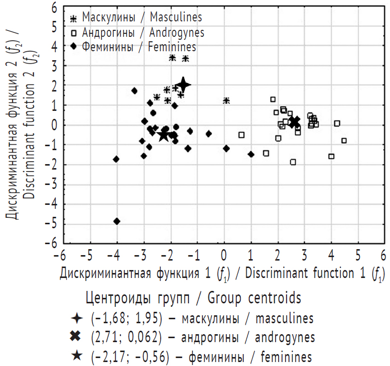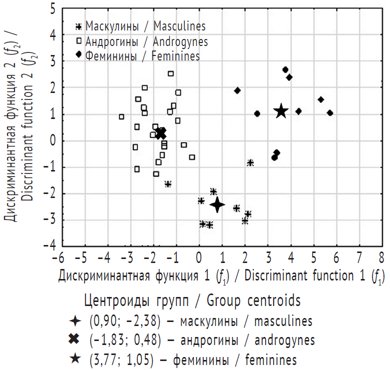 Рис. 2. Распределение женщин с разной полоролевой идентичностью на плоскости дискриминантных функций