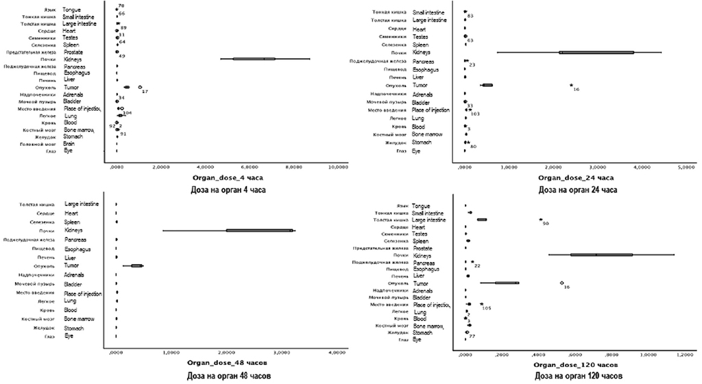 Оценка производилась в четырех контрольных точках исследования — через 4–24 и 48–120 ч после введения РФЛП. С учетом пилотного характера эксперимента и данных о периоде полураспада радионуклида в препарате, при изучении его биораспределения и кинетических характеристик оценивались данные, полученные от 5 особей мышей в каждой контрольной точке.