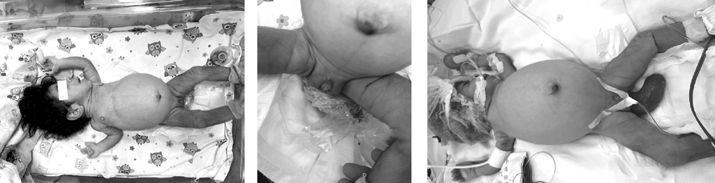 From week 3 of life, the patient’s condition sharply deteriorated due to a fever of up to 39°C, tachycardia, tachypnea, moderate abdominal distension, and acholic stools. The patient stayed in the intensive care unit. Clinical blood tests revealed a decrease in hemoglobin level to 110 g/L, leukocytosis to 23.6–34.2 thousand, and change in the leukogram because of an increase in the stab neutrophil count. The biochemical blood test revealed hypoproteinemia up to 40.0 (Normal range [N] 44–76) g/L; hyperenzymemia with alanine aminotransferase of 60.0 (N 0–40) U/L and aspartate aminotransferase of 62.0 (N 0–40) U/L, gamma-glutamyl transferase of 387.0 (N 9–36) U/L; hyperbilirubinemia with a total bilirubin of 63.5 (N 3.4–20.5) mmol/L and direct bilirubin of 45.4 (N 0.0–8.6) mmol/L. Urinalysis showed marked proteinuria up to 8.8 g/L, erythrocyturia of 10,501.0 cells/µL, leukocyturia of 358.0 cells/µL, and persistent oxaluria.