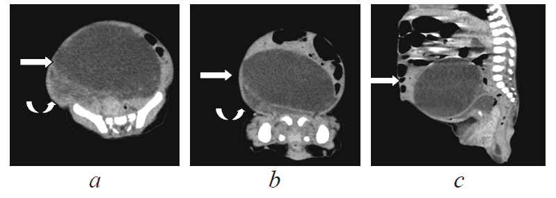 Fig. 2. CT reconstructions: а — axial, b — coronal, c — sagittal projections. Arrows indicate cystic formations