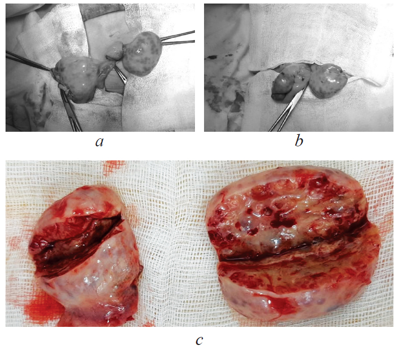 Fig. 3. Surgical treatment: a, b — resection of the right ovary; c — macropreparation, resected ovaries