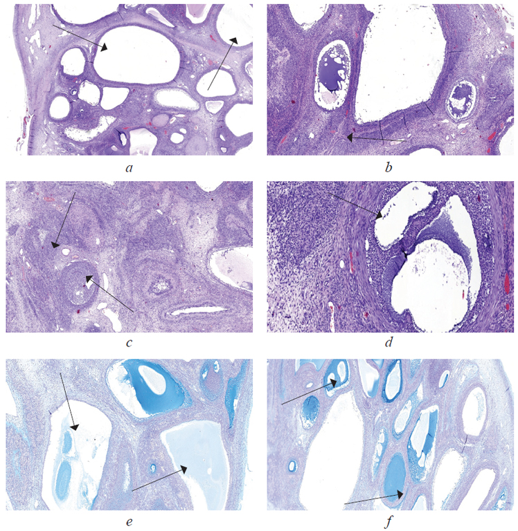 Fig. 4. Micropreparation. Ovarian tissue: а — staining hematoxylin-eosin. Magnification ×25. Big and small follicular cysts (arrows), the wall is formed by fibrous connective tissue; b — staining hematoxylin-eosin. Magnification ×40. Big and small follicular cysts (arrow), the wall is formed by fibrous connective tissue; c — staining hematoxylin-eosin. Magnification ×20. Cysts with luteinization, theca cells (arrows); d — staining hematoxylin-eosin. Magnification ×40. Cysts with luteinization, theca cells (arrow); e — staining: alcyan blue. Magnification ×40. Big and small follicular cysts (arrows), the wall is formed by fibrous connective tissue; the lining of cysts is formed by multinuclear follicular epithelium; f — staining alcyan blue. Magnification ×40. Big and small follicular cysts (arrows), the wall is formed by fibrous connective tissue; the cyst lumen has basophilic alcyan-positive content