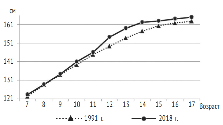 Длина тела — наиболее жестко генетически детерминированный показатель физического развития. Мы проанализировали показатели ДТ обследованных школьников и сравнили их с региональными нормативами, разработанными тридцать лет назад. Анализ данных проведен по 25, 50 и 75-му перцентилям, но, поскольку получены однотипные результаты, в данной статье мы сочли возможным представить динамику показателей ДТ только по 50-му перцентилю. Было установлено, что у современных школьников ДТ больше, чем у сверстников тридцать лет назад. У мальчиков разница величины ДТ максимальна во время пубертатного скачка роста (2,7–4,2 см), но к 17 годам она сокращается до 0,7 см (рис. 1).