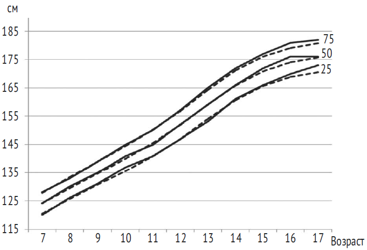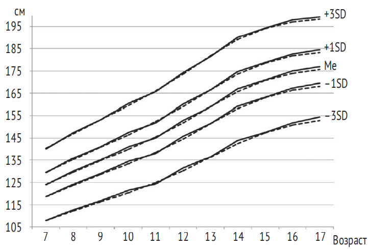 Методом случайной выборки обследовано 6207 учащихся общеобразовательных школ в различных районах Санкт-Петербурга (3225 мальчиков и 2982 девочки) в возрасте от 7 до 17 лет. На участие школьников в исследовании было получено информированное согласие их законных представителей. Детям проводили измерение длины тела (ДТ) по унифицированной методике. Возрастные группы формировали в соответствии с точным паспортным возрастом с интервалом в 1 год (± 6 мес.). Наполняемость возрастно-половых групп составила от 112 до 474 человек, что обеспечило корректность статистического анализа. Статистическую обработку материала выполняли с использованием методов вариационной статистики с помощью прикладных программ Statistica v. 10.0© Statsoft; были рассчитаны параметрические (Ме — медиана, SD — стандартное отклонение) и непараметрические параметры (25, 50 и 75-й перцентили). Проведено сравнение с показателями ДТ региональных [2] и международных нормативов [8] физического развития детей и подростков.