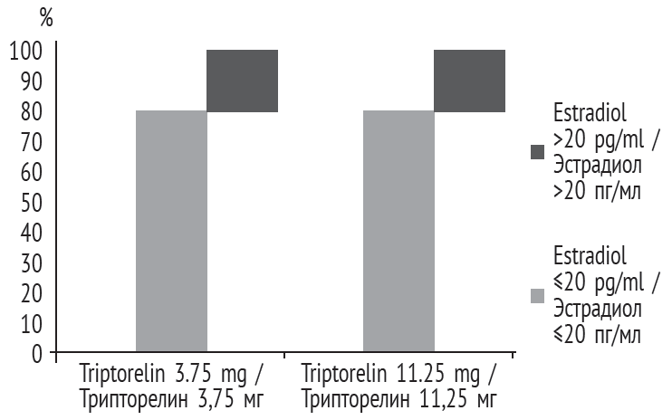 Рис. 2. Количество пациенток (%), у которых уровни базального эстрадиола не превышали 20 пг/мл при лечении Трипторелином 3,75 мг и 11,25 мг