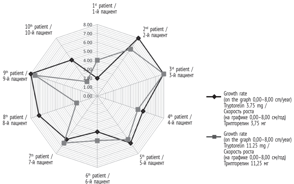 Growth rates before treatment with drugs of the GnRH antagonist group and during therapy with triptorelin 11.25 mg are illustrative (11.2 ± 3.6 and 5.75 ± 1.5 cm/year, respectively), which meets the efficiency criterion for reducing the growth rate to the age norm.