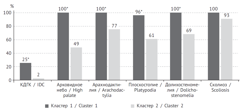 Рис. 1. Фенотипическая характеристика юношей (≥4 костных признаков) 1-го и 2-го кластеров. КДГК — килевидная деформация грудной клетки, *р < 0,005