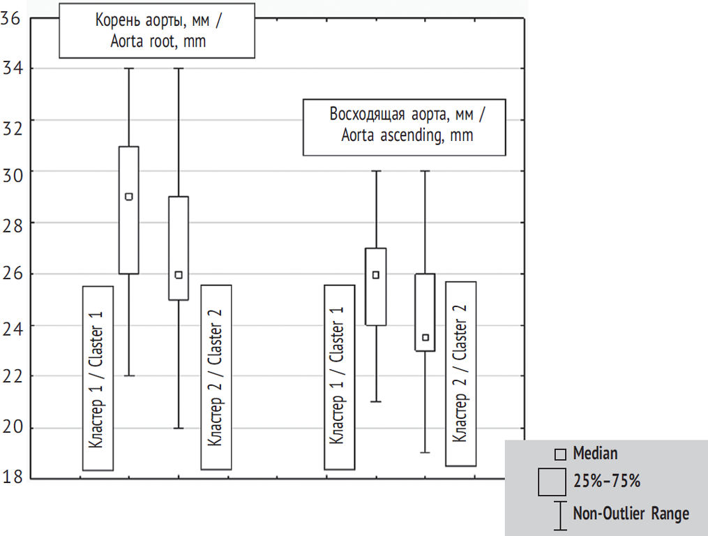 Сформированные кластеры достоверно различались по количеству костных признаков — среднее их число оказалось выше в кластере 1 (4,9 ± 0,6 и 4,3 ± 0,5, р = 0,00001). Достоверно выше в кластере 1 частота таких значимых признаков, как деформация грудной клетки, арахнодактилия, а также долихостеномелия. Далее в сформированных кластерах был определен диаметр корня и восходящей аорты (рис. 2).