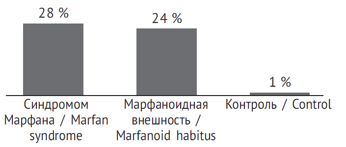 Рис. 3. Частота выявления расширения аорты (Z-критерий > 2,0) у пациентов с синдромом Марфана и марфаноидной внешностью