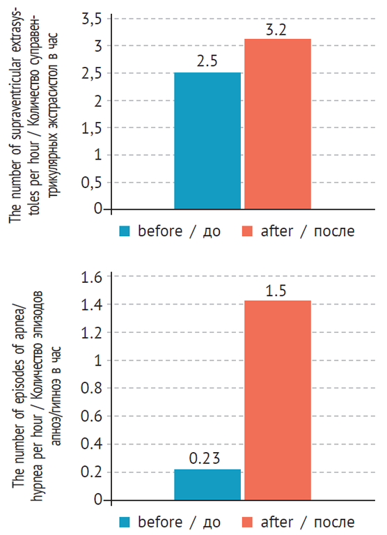 Рис. 2. Количество суправентрикулярных экстрасистол и эпизодов апноэ/гипноэ у женщин до и после индукции суперовуляции (р < 0,05)