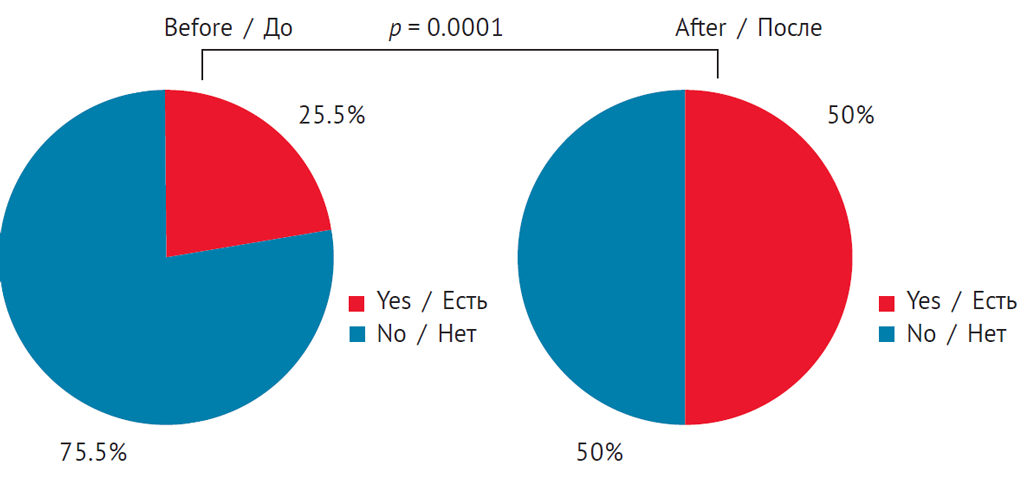 Quantitative variables are presented as arithmetic mean ± standard deviation (M ± σ) or confidence intervals (CIs). Categorical variables are presented as the frequency of detection and/or as percentage share. Hypothesis on the equality of two mean values for parametric data was tested using the Student t-test for dependent samples (when comparing the indicators over time). The differences were considered statistically significant at p < 0.05. To identify the relationship between quantitative accounting parameters, a correlation analysis was performed with the determination of the Pearson correlation coefficient (r). To identify the relationship between quality accounting parameters, the χ2 criterion was determined. To identify the relationship between several parameters, a multiple regression analysis was performed with the step-by-step exclusion of variables. The multiple regression model included factors with a significant regression coefficient B (p < 0.05).