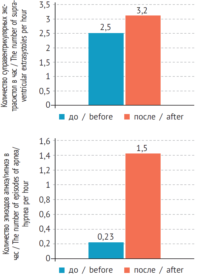 Согласно полученным данным желудочковая экстрасистолия не встречалась у обследованных женщин как до, так и после проведения стимуляции суперовуляции. В динамике отмечалось увеличение среднего количества наджелудочковых экстрасистол по сравнению с исходным состоянием (до — 2,51 ± 1,61, после — 3,20 ± 2,95 экстрасистол в час; р < 0,05) и увеличение среднего количества эпизодов апноэ/гипноэ (до — 0,23 ± 0,12, после — 1,51 ± 0,81 в час; р < 0,01) (рис. 2).