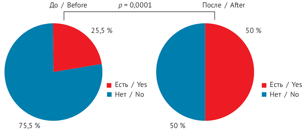 До стимуляции суперовуляции эпизоды апноэ/гипноэ наблюдались у 22,5 % женщин, а после проведения манипуляции — у 50,0 % (χ2 = 15,7, р < 0,01) (рис. 3).