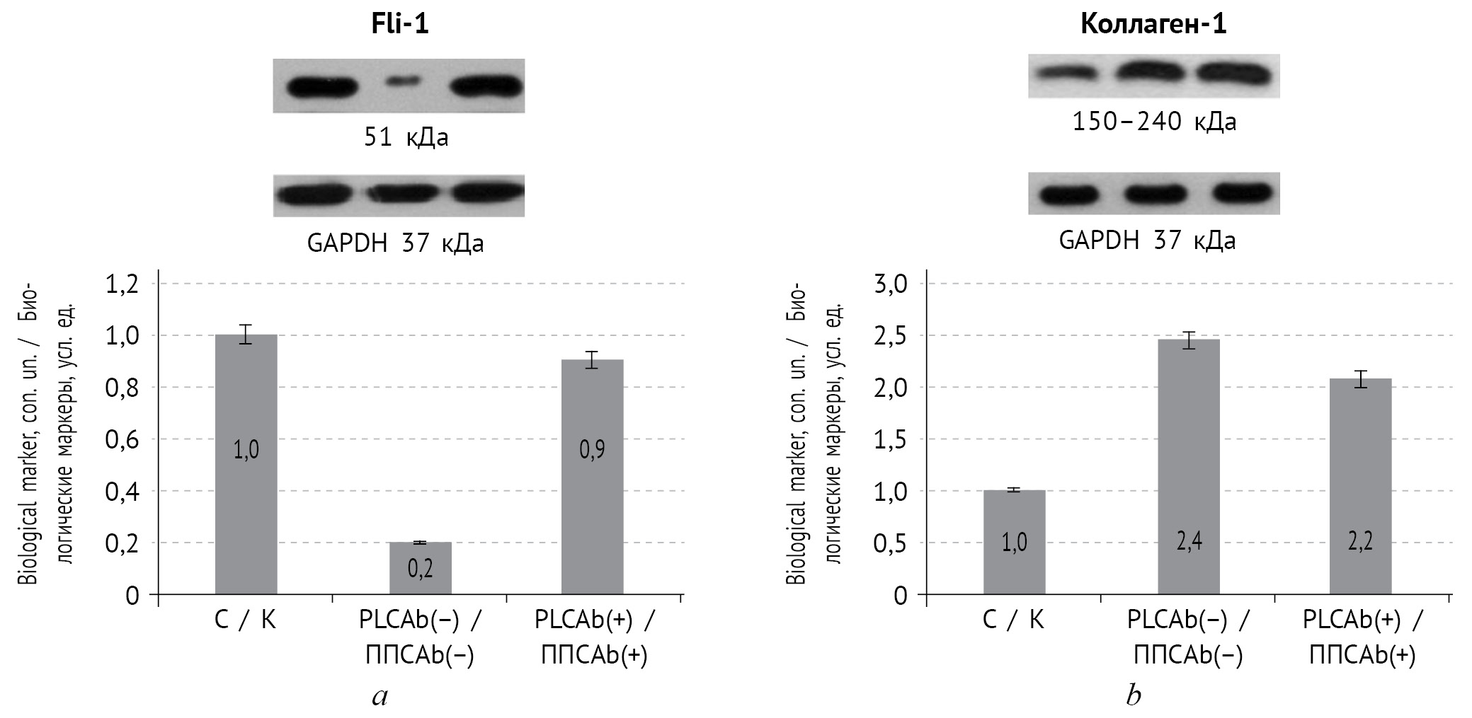 Рис. 2. Уровень биологических факторов в грудной аорте: Fli-1 (а), коллагена-1 (b). К — группа крыс с обычной диетой (контроль), ППСAb(–) — группа крыс с преэклампсия-подобным состоянием, которым не вводились антитела к МБГ, ППСAb(+) — группа крыс с преэклампсия-подобным состоянием, которым вводились антитела к МБГ