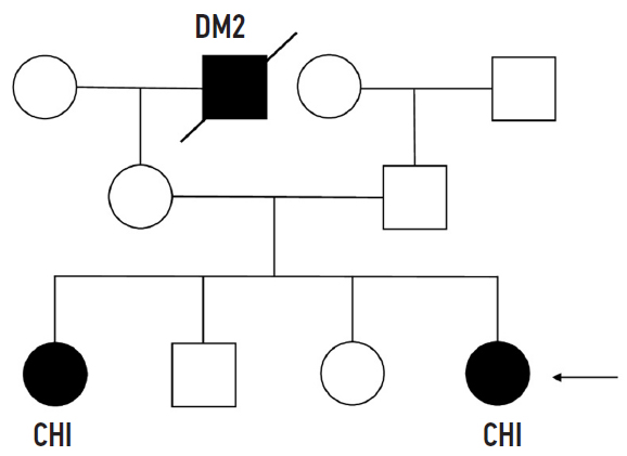 С целью окончательной верификации диагноза и персонифицированного подхода к лечению проведено молекулярно-генетическое исследование (МГИ): в гене ABCC8 (NM_000352.6) в экзоне 2 обнаружена замена одного нуклеотида в гомозиготном состоянии, приводящая к замене аминокислоты c.259T>C, p.Cys87Arg. Данная мутация в гене ABCC8 выявлена у отца, матери и старшей сестры с органическим поражением ЦНС и персистирующими гипогликемиями. Диагноз у старшей сестры верифицирован после получения результатов МГИ всех членов семьи в возрасте 12 лет. Генеалогические данные пациентки представлены на рис. 1.